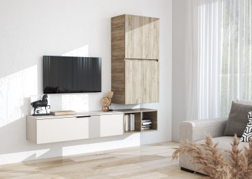 - Гостиная создана с целью минимального использования пространства, но имеет множество закрытых и открытых мест для хранения вещей. Подвесная тумба подчеркивает её невесомость.